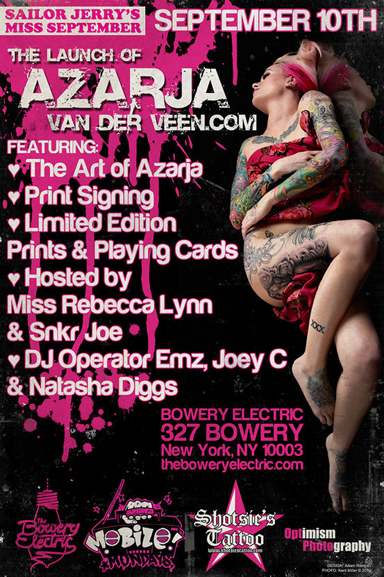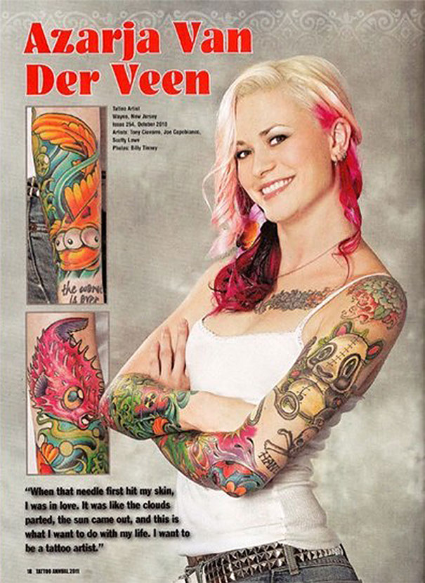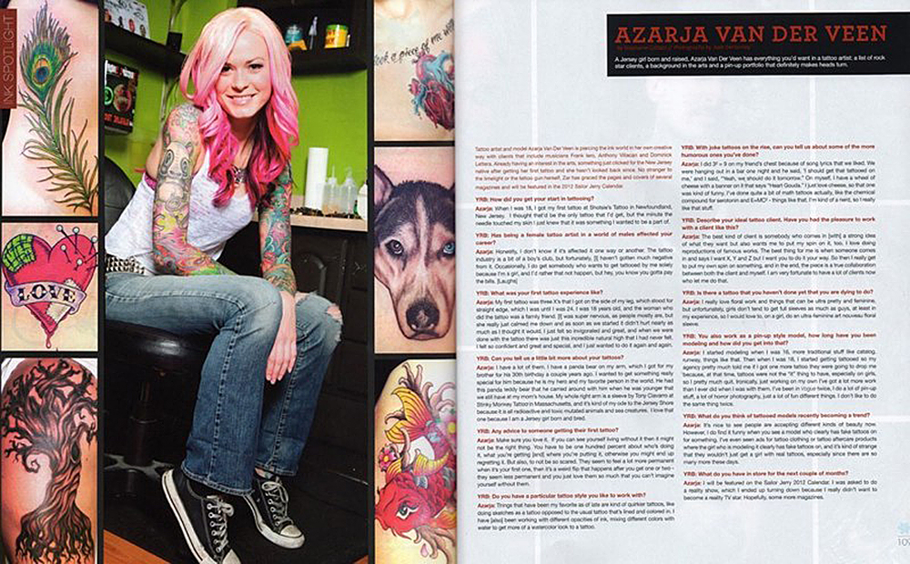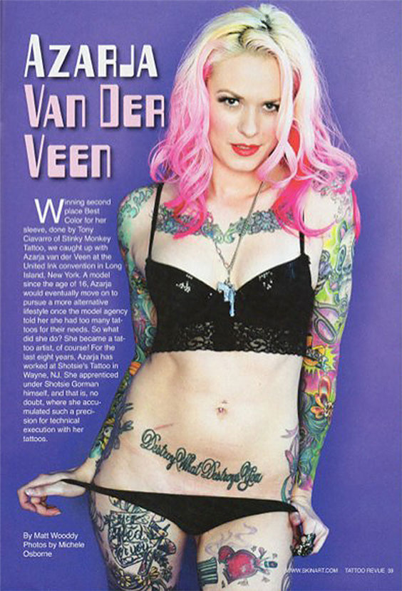 Azarja van der Veen is a tattoo artist and model based out of northern New Jersey who became enamored with tattoo culture at the age of 17 and never looked back. In her youth she frequented shops, building her own stunning collection of magazine worthy ink.