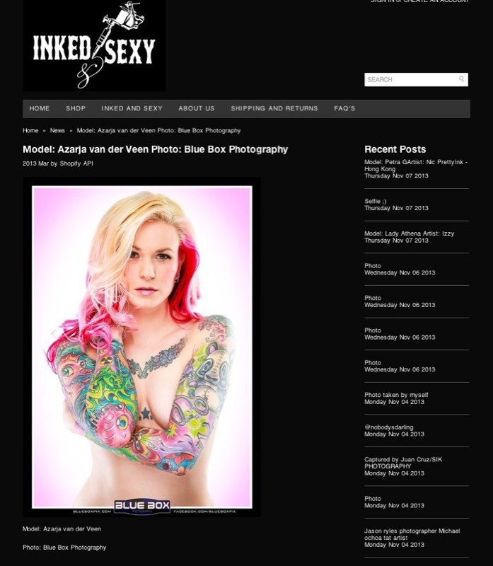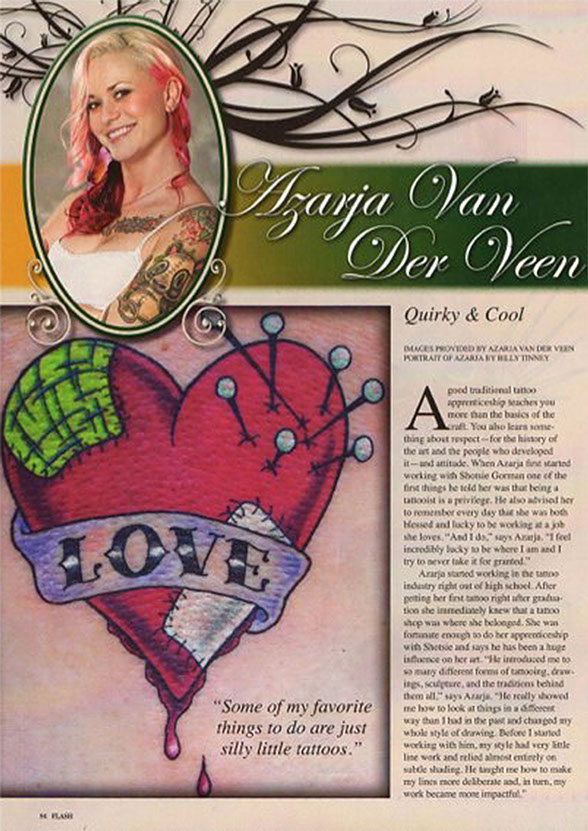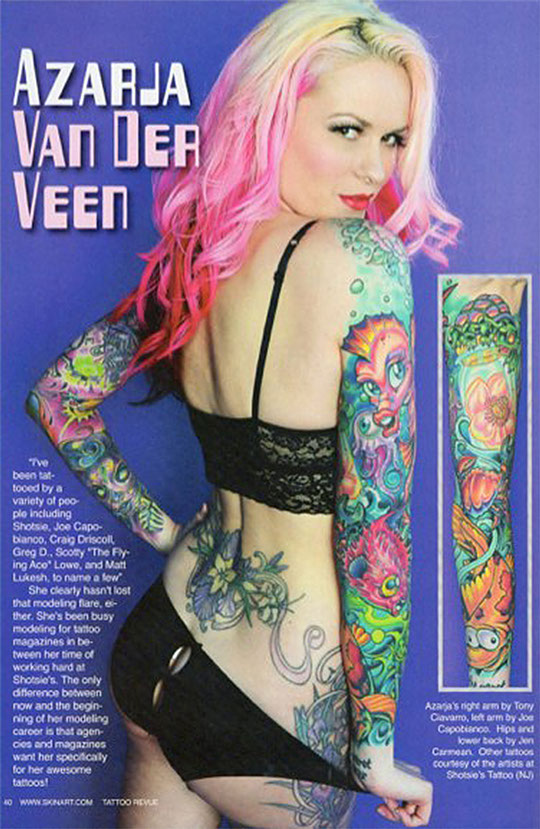 Azarja is just as versatile with her modeling work as she is with her artwork. She has been interviewed about her tattoo work by some of the most popular titles in the market including TATTOO, FLASH and INTERNATIONAL TATTOO ART. Her work has also been featured in several magazines, books and blogs.