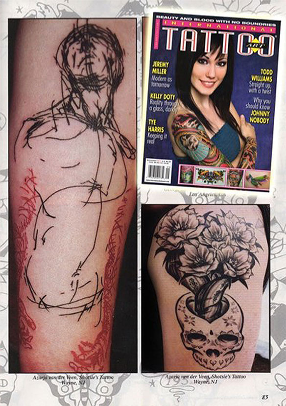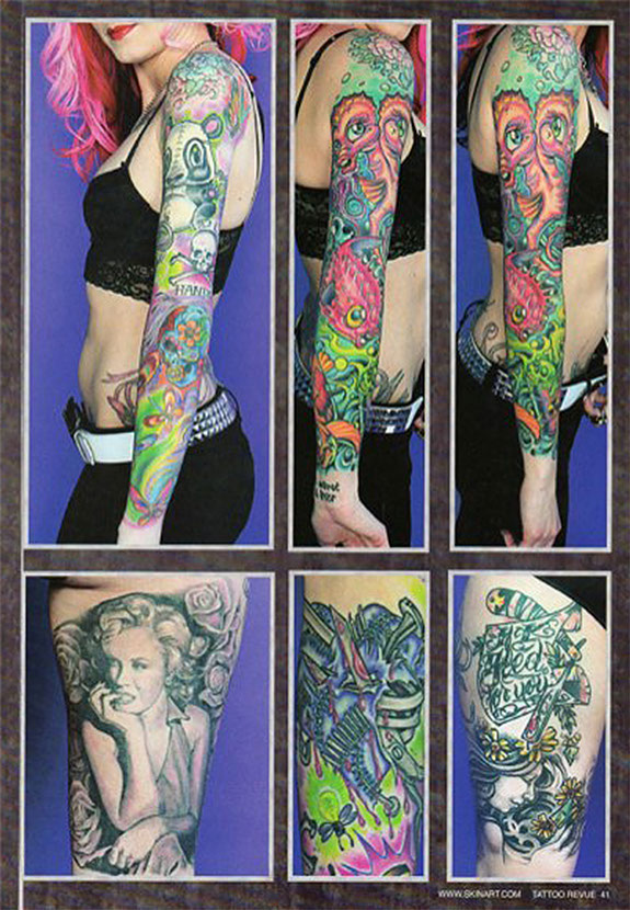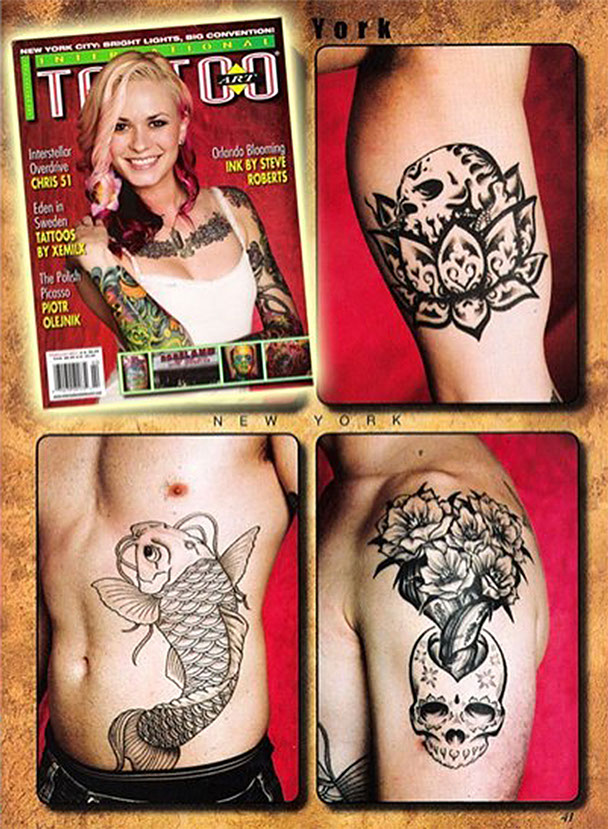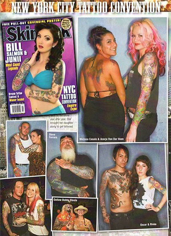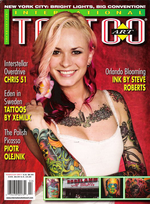 Over the years she has become a staple in the tattoo scene: gracing covers of some of the most influential magazines and frequently working events, such as International Tattoo Art and the annual New York City Tattoo Convention.
