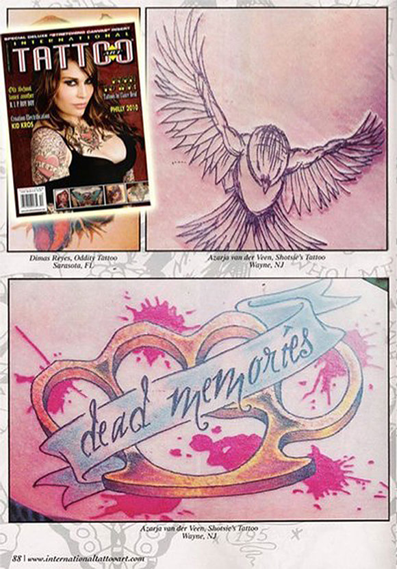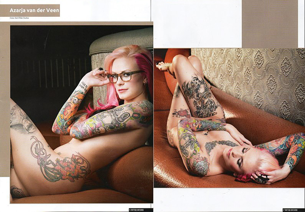 Azarja is just as versatile with her modeling work as she is with her artwork. She has been interviewed about her tattoo work by some of the most popular titles in the market including TATTOO, FLASH and INTERNATIONAL TATTOO ART. Her work has also been featured in several magazines, books and blogs.