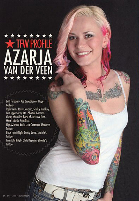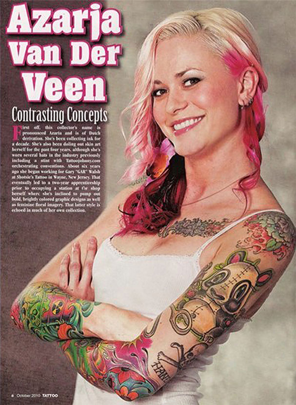 Azarja van der Veen is a tattoo artist and model based out of northern New Jersey who became enamored with tattoo culture at the age of 17 and never looked back. In her youth she frequented shops, building her own stunning collection of magazine worthy ink.